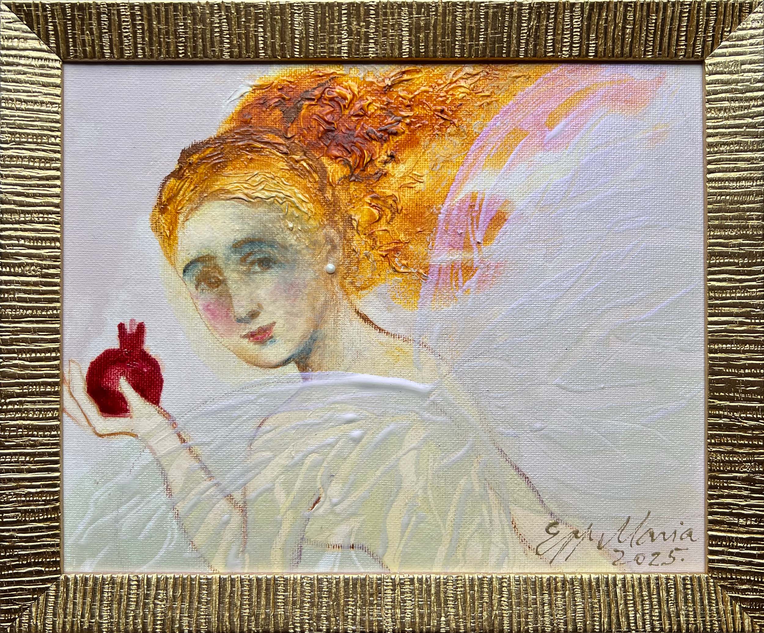 Haldjas granaatõunaga vaatab sind Suurus: 23x29 cm Aasta: 2025 Tehnika: Õli / akrüül / lõuendkartongil Formaat raamiga Hind: 680 € Pane korvi Maksma jaga